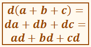 Згідно з цим законом: множення, розподілити між окремими доданками. Оскільки добуток не змінюється від переставлення співмножників, то з розподільного закону випливає, що множення числа на суму можна замінити множенням цього числа на кожний доданок окремо з дальшим додаванням результатів, тобто: