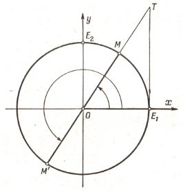 больший радиуса круга. Если через точку Т и центр круга О провести прямую, то она пересечёт единичную окружность в точках М и М'. Это – концы подвижных радиусов, образующих с положительным направлением оси Ох углы, тангенсы которых равны 1,5. На чертежеотмечены два таких угла.